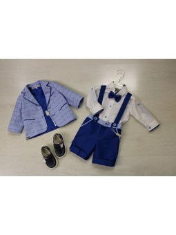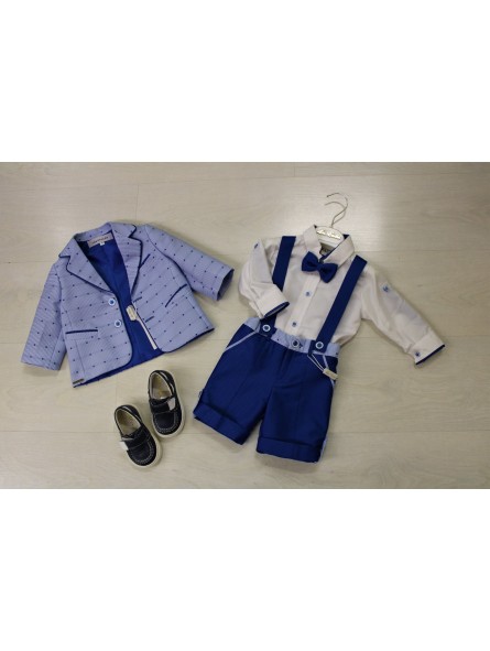 Completo battesimale 4 pezzi: giacca in cotone jacquard con fantasia, camicia manica lunga in cotone tinta unita, pantalone corto (lunghezza dopo il ginocchio) in cotone jacquard tinta unita con bretelle, papillon tinta unita