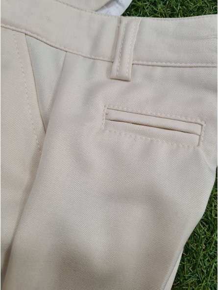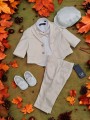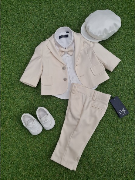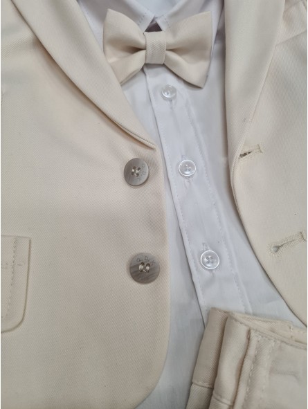 Completo 4 pezzi composto da: giacca con tasca a toppa, camicia con manica risvoltabile, papillon e pantalone regolabile in vita