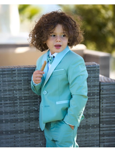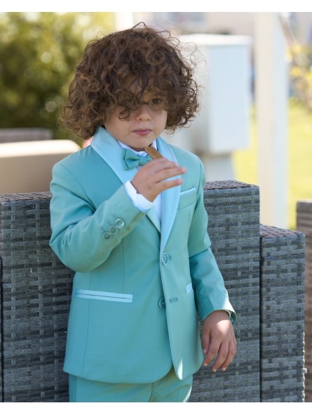 Completo quattro pezzi in cotone composto da giacca con collo sciallato lucido, pantalone, camicia e papillon.