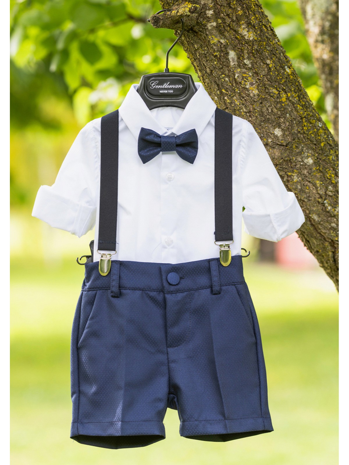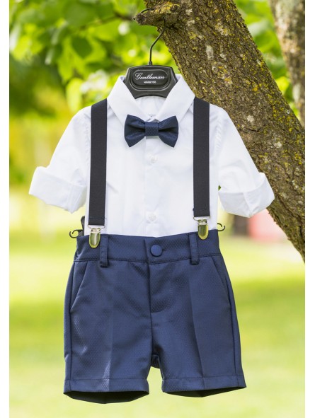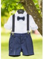 Completo quattro pezzi composto da pantalone corto, camicia, papillon e bretelle