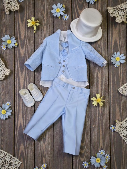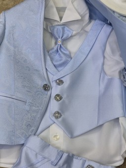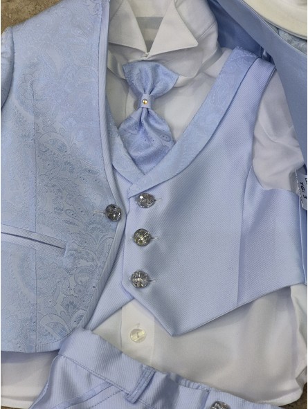 Completo di alta sartoria Italiana 5 pezzi, giacca in tessuto operato delicato, collo alla coreana e bottoni gioiello, camicia con collo alla diplomatica e gilet con collo sciallato, papillon e pantalone con inserti operati.