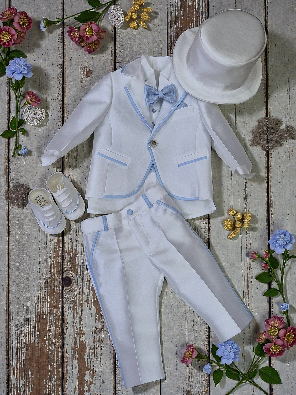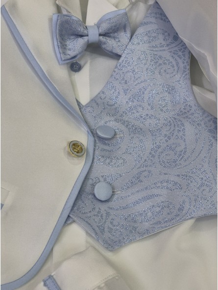Abito di alta sartoria Italiana, cinque pezzi : giacca con bottone gioiello, camicia con collo alla diplomatica , papillon e gilet doppiopetto lavorato, pantalone regolabile in vita.