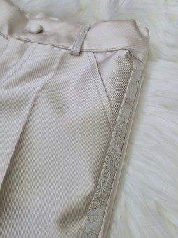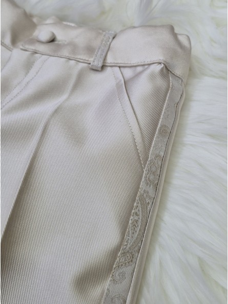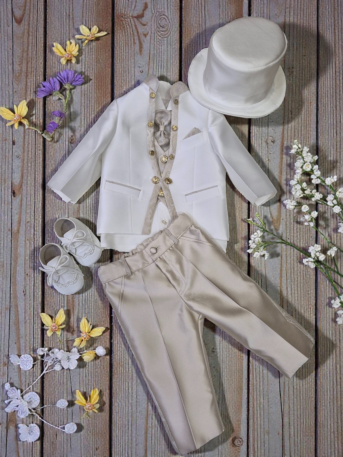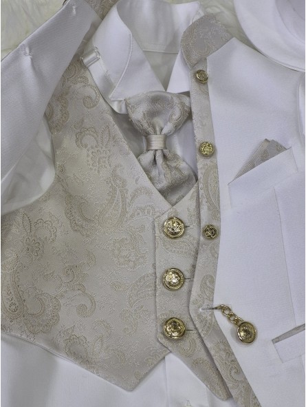 Completo di alta sartoria Italiana 5 pezzi, giacca con inserti in tessuto operato delicato, collo alla coreana e bottoni gioiello, camicia con collo alla diplomatica e gilet, cravatta e pantalone con inserti operati.