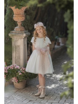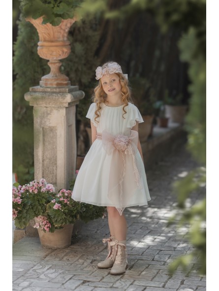 Abito in chiffon con manichina , fascia in organza e applicazioni floreali removibili . Fodera in cotone.